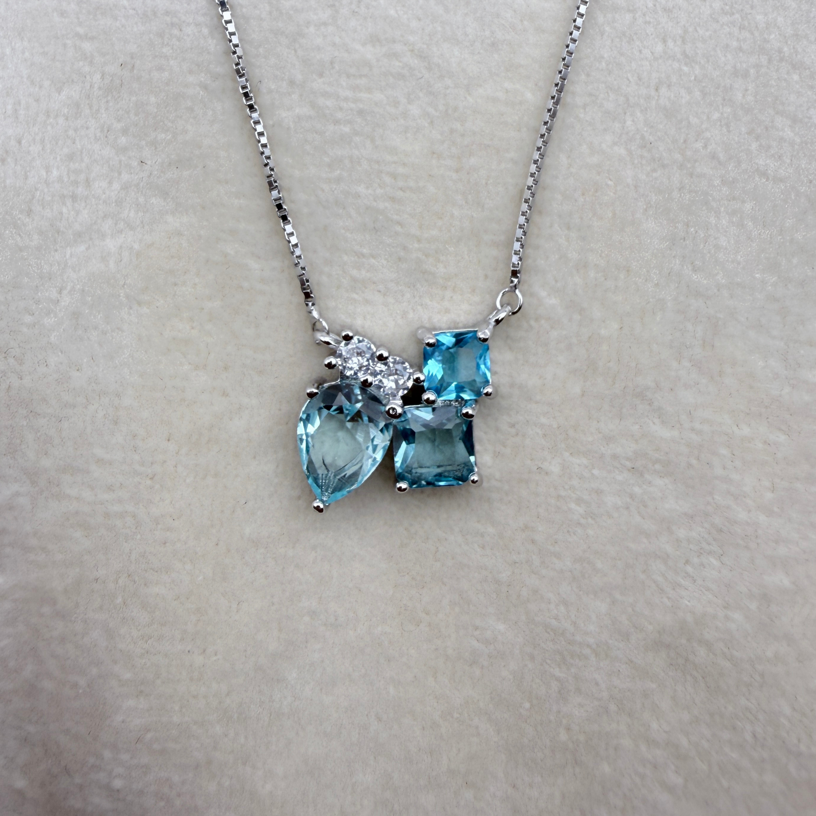 Silver Blue Gemstone Cluster Necklace. This artistic piece features a dazzling