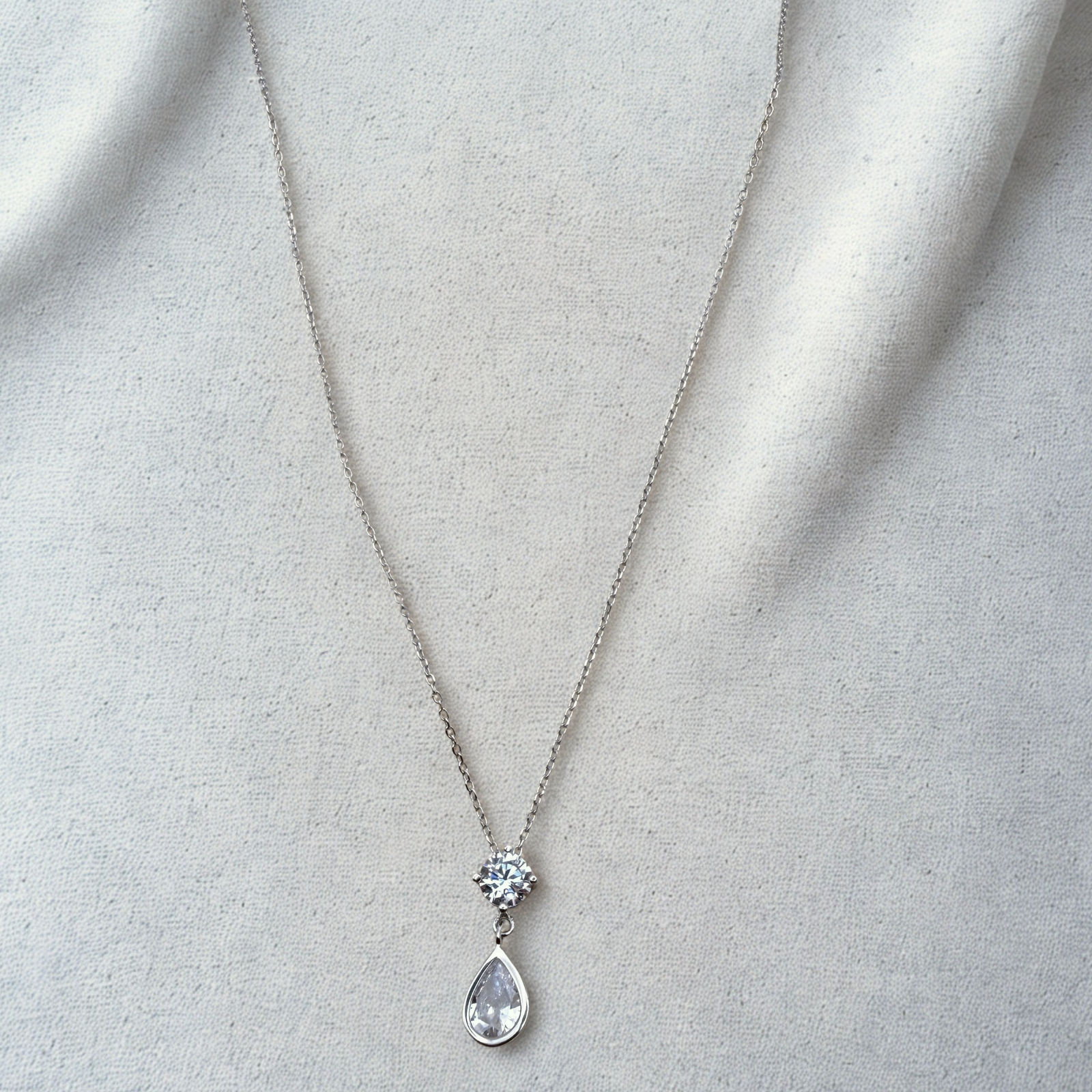 which gracefully suspends a larger pear-cut cubic zirconia drop.
