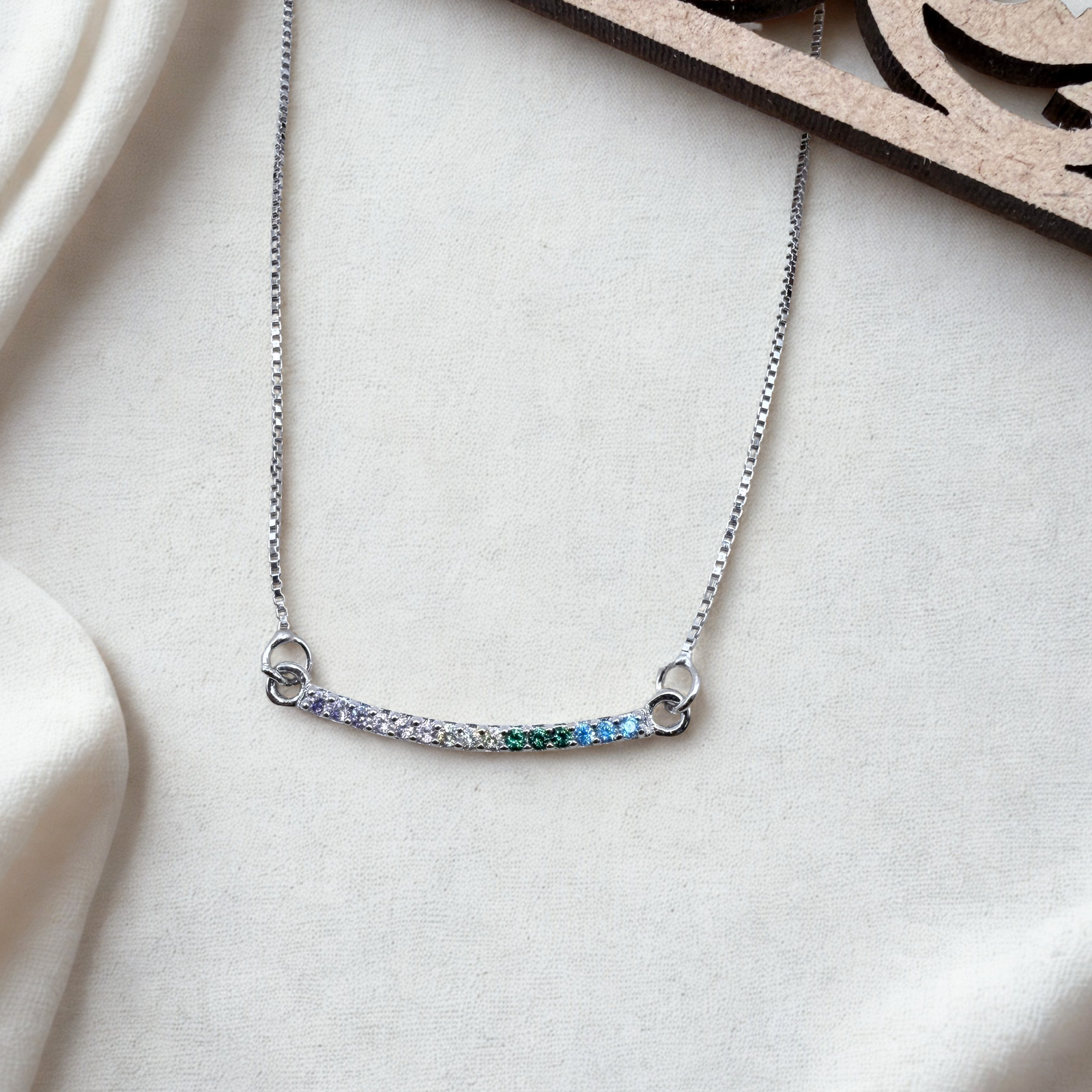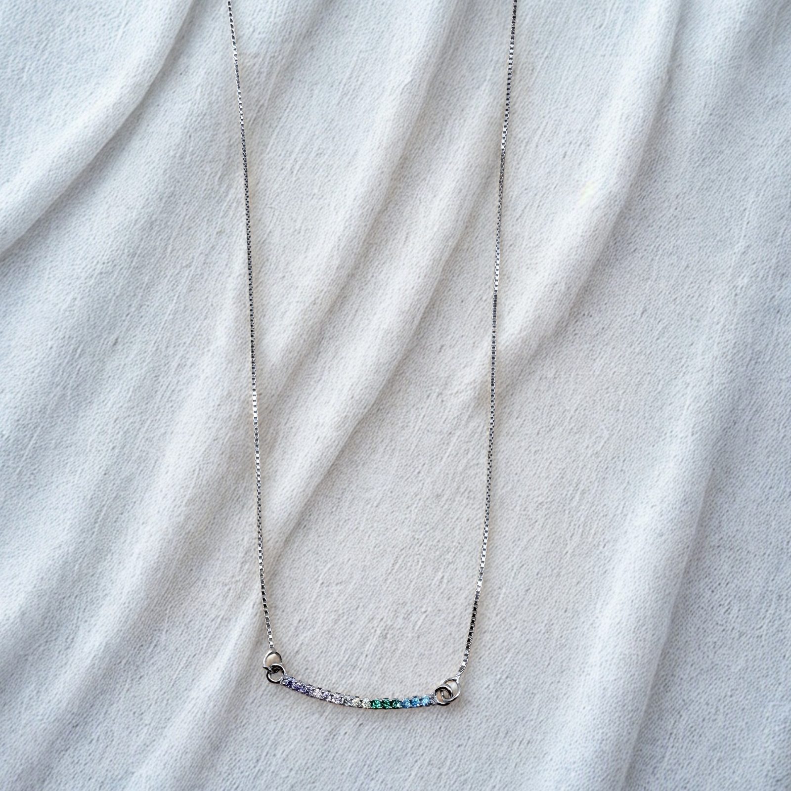 This Sterling Silver Rainbow Bar Necklace features a slim,
