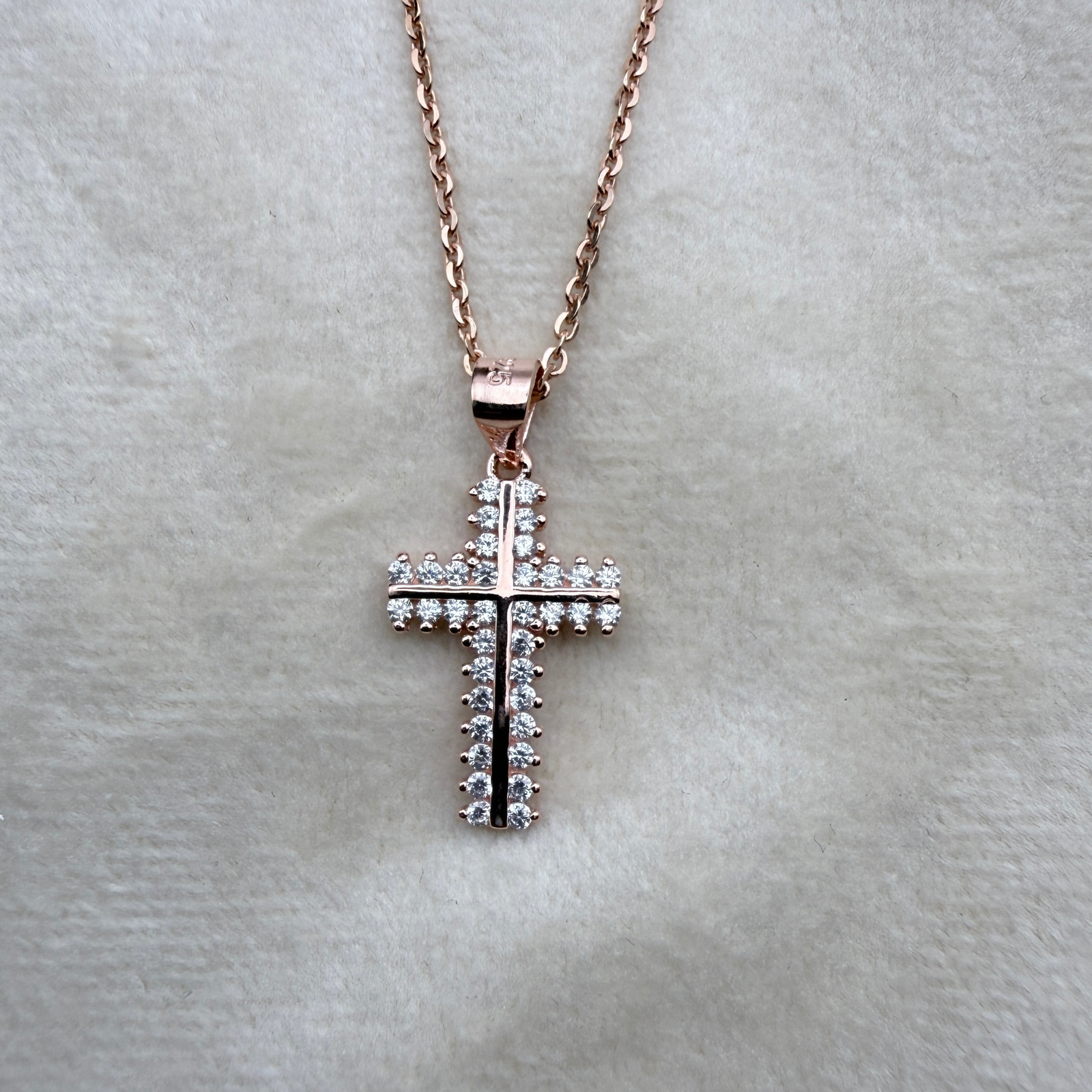 Rose Gold Pavé-Set Silver Cross 925 Sterling Silver Pendant + Chain