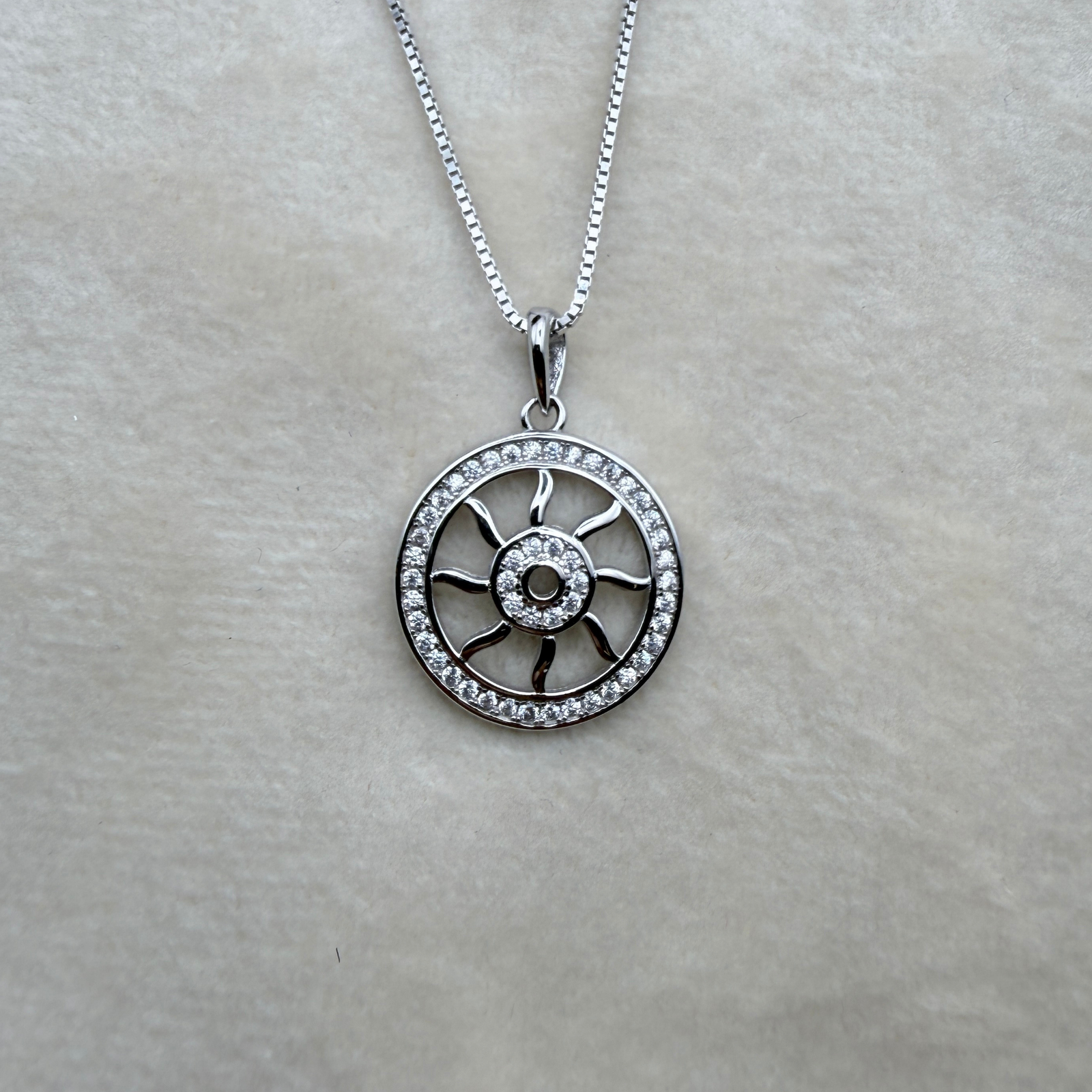 The circular charm showcases an intricate, stylized wheel or sunburst design at its core,