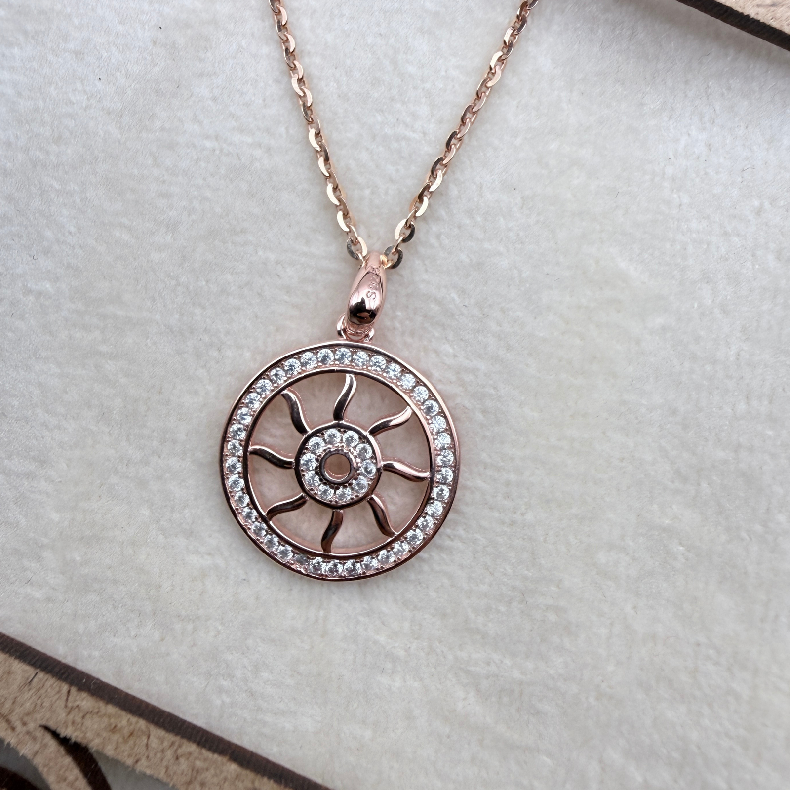 making the pendant a striking focal point. It hangs from a delicate rose gold press chain.